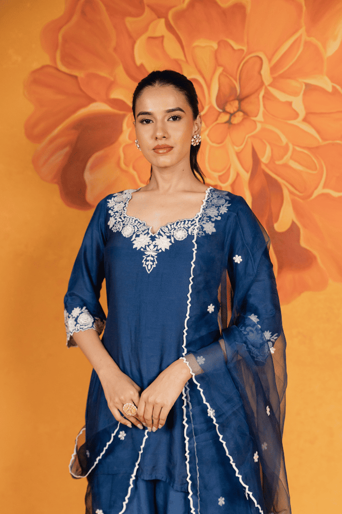 Featuring a flared, ink blue cotton silk anarkali, elegantly embroidered with off-white floral motifs. It is paired with matching palazzo...