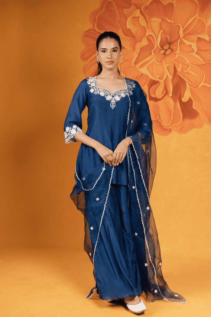 Featuring an ink blue cotton silk, short kurti with floral embroidery on neck line and sleeves. It is paired with...