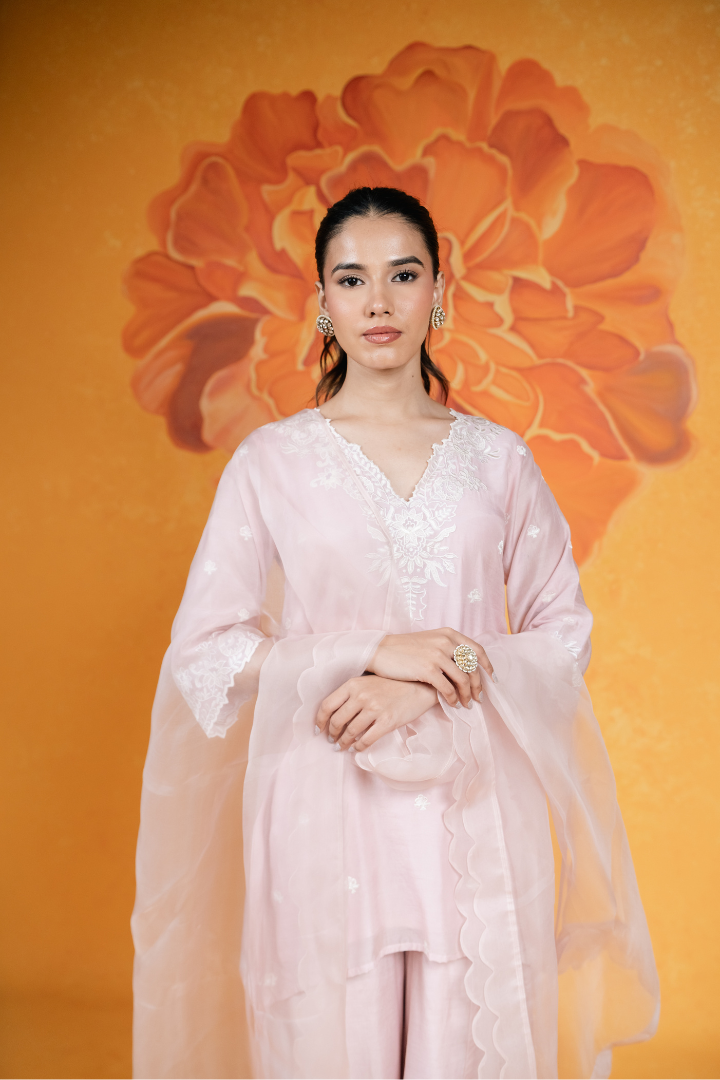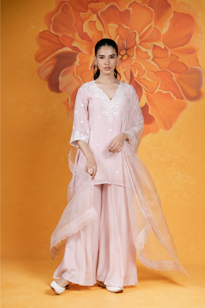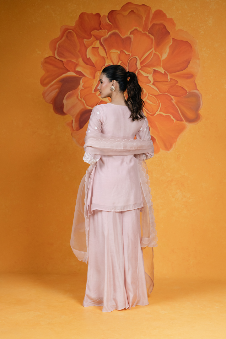 Featuring a blush pink, cotton silk short kurti with floral embroidery on the neckline and sleeves. It is paired with flared pants and a silk organza dupatta with scallop detail.