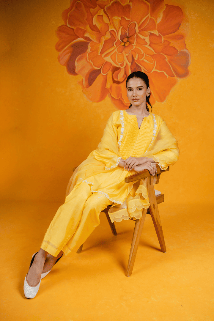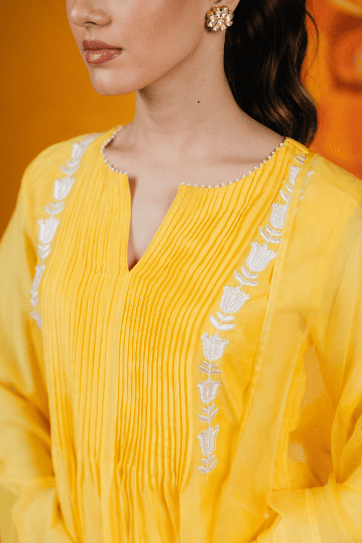 Featuring a cotton silk short kurti with intricate pleats and delicate embroidery. It is paired with straight pants with scallop detail, silk organza dupatta.